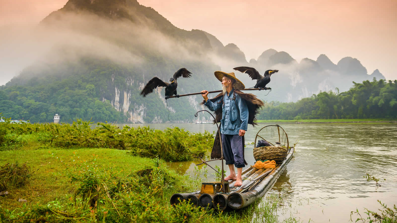 Drive 1 hour back to Guilin. Enjoy a leisurely walk around Ronghu Lake and a visit to the Sun & Moon Pagodas for spectacular views over downtown Guilin. Take a tour of the South China Pearl Factory where you will have the opportunity to buy these precious stones. This evening, stop on the banks of the Li River for a photo opportunity with a genuine cormorant fisherman.